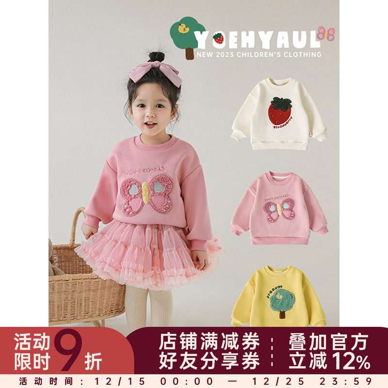 女童多巴胺甜美卫衣中大童毛巾绣花圆领长袖加绒加厚保暖儿童上衣