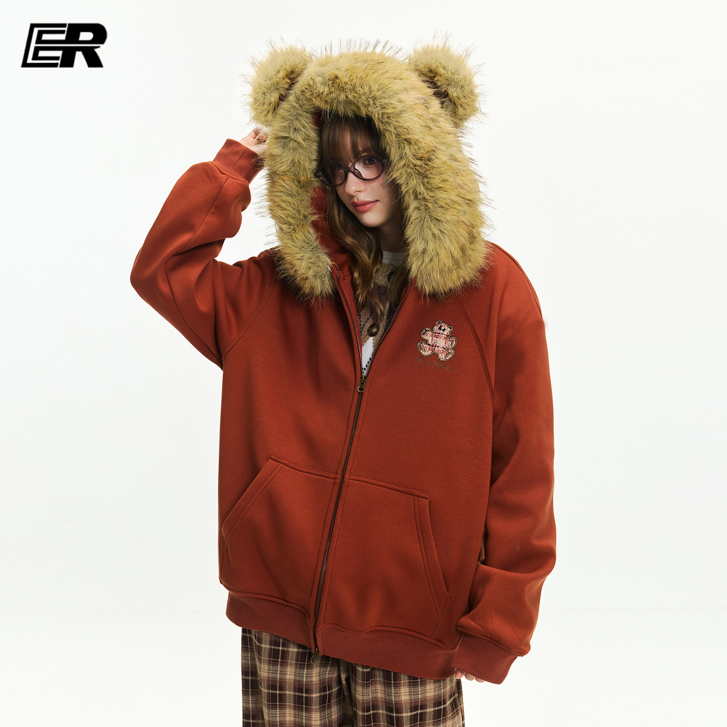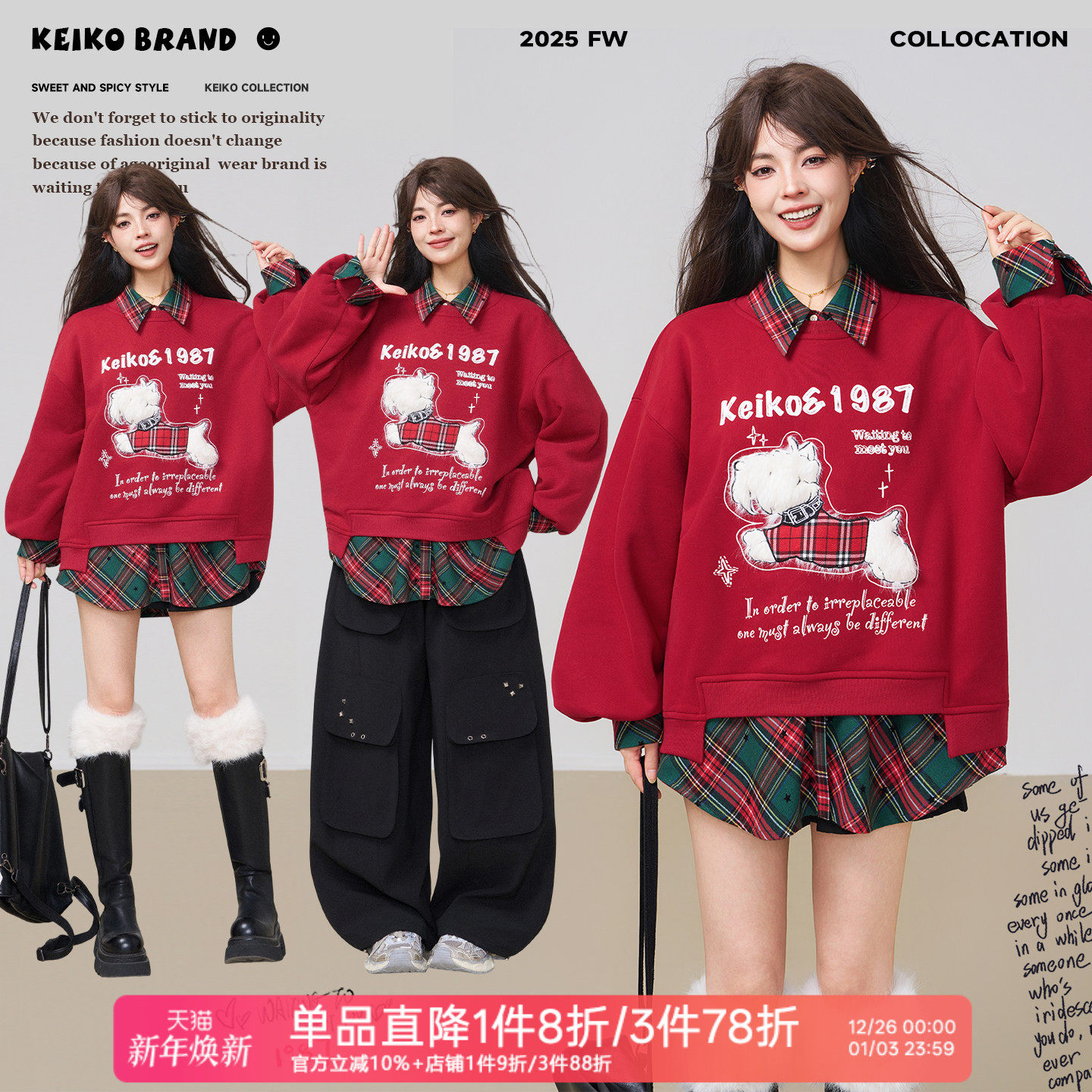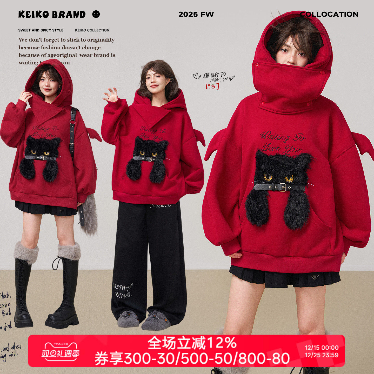 KEIKO 怪趣毛绒绣花红色连帽卫衣女25秋冬少女感宽松休闲加绒外套