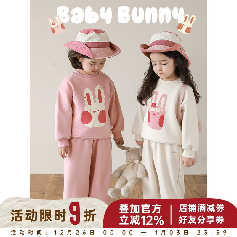 幼悠女童加绒加厚运动套装冬季小兔印花卫衣字母绣花宽松运动裤潮