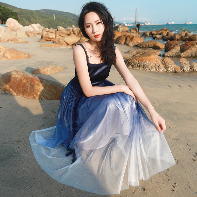 海边度假沙滩裙渐变色连衣裙中长款2024新款仙气网纱吊带裙女夏