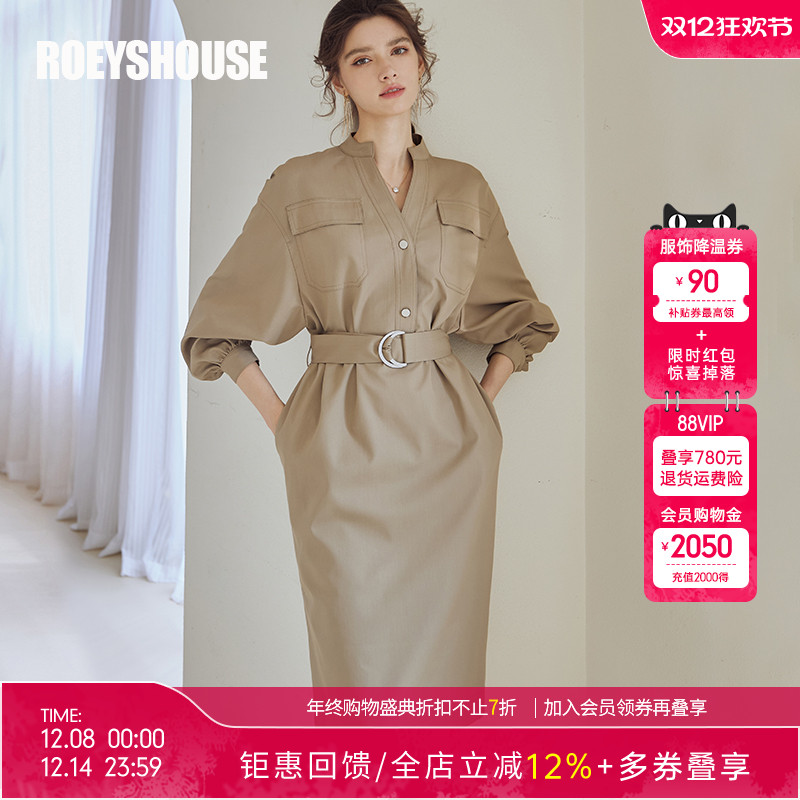 罗衣通勤V领收腰长袖连衣裙女秋冬别致卡其绿系带中长裙子07245