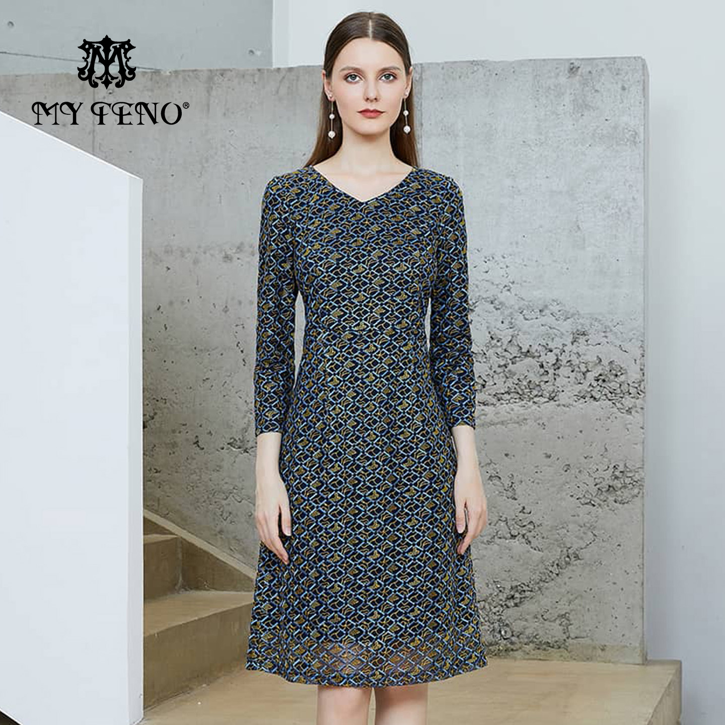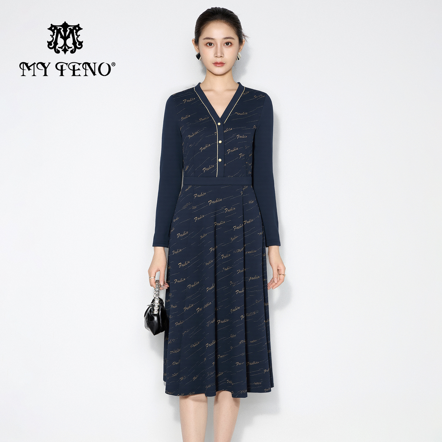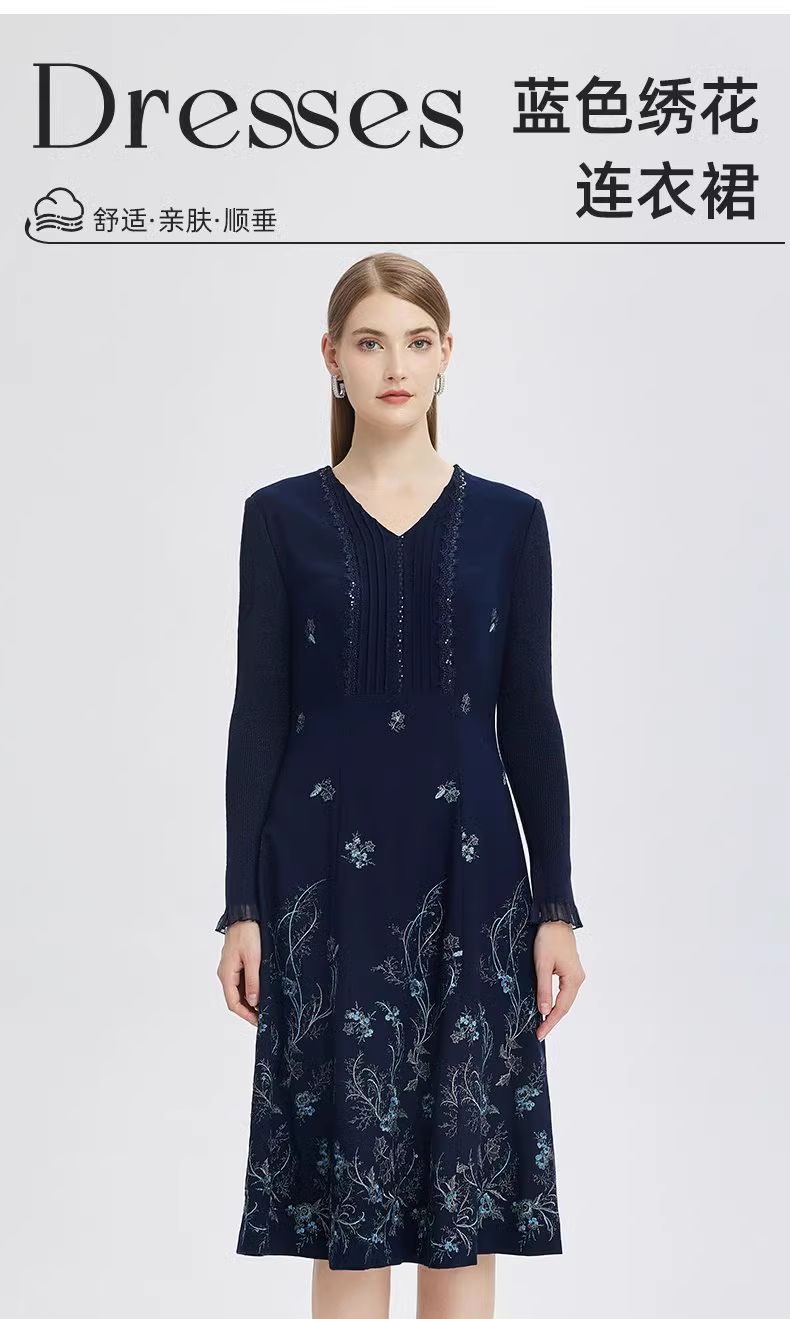马天奴2025秋冬新款藏青提花V领收腰长袖连衣裙子气质时尚优雅女