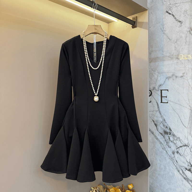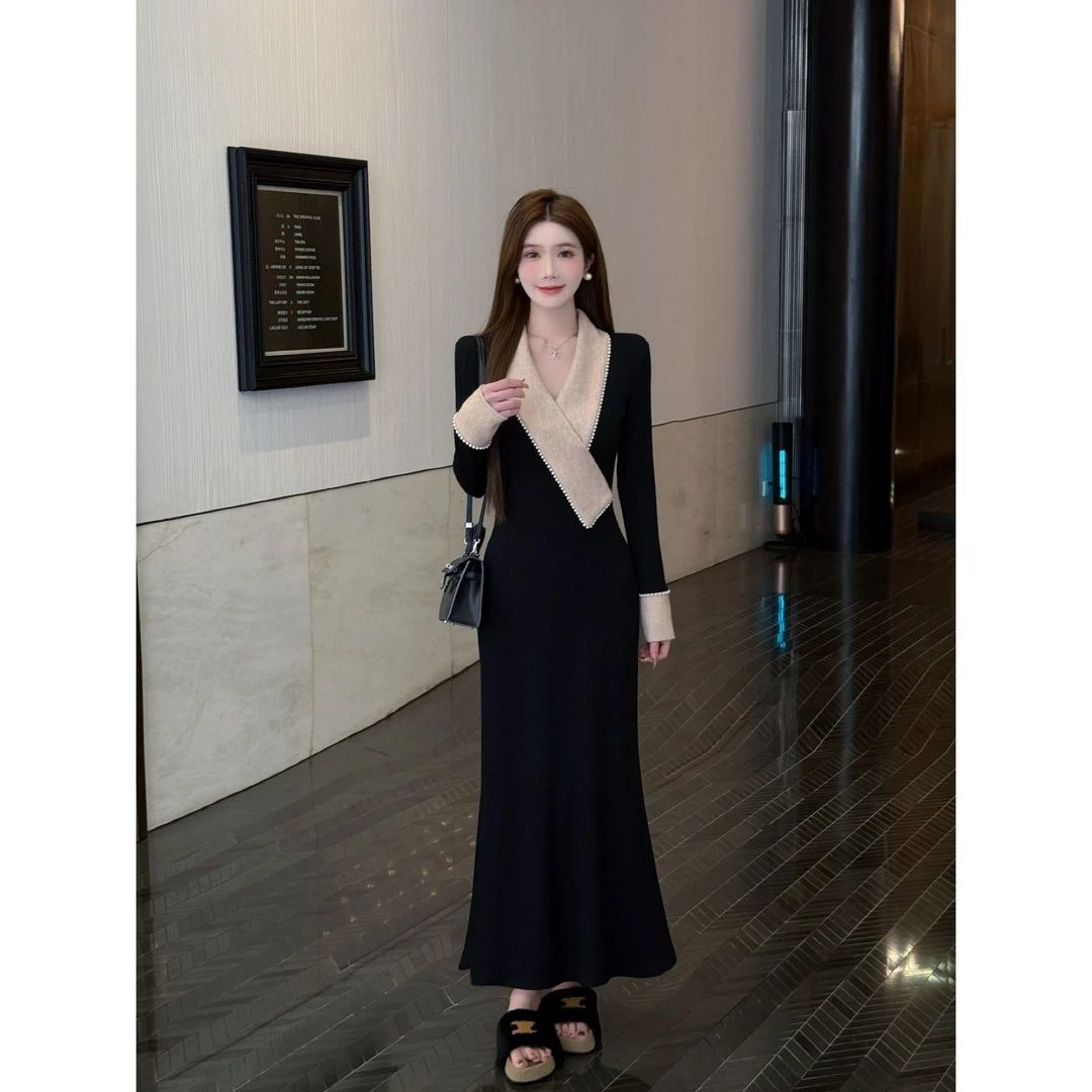 阔色赫本风v领收腰长袖连衣裙女25秋冬新款针织打底小黑裙短裙子