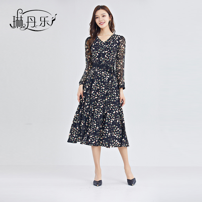 琳丹乐妈妈秋装新款法式v领收腰长袖连衣裙洋气高档碎花显瘦39055