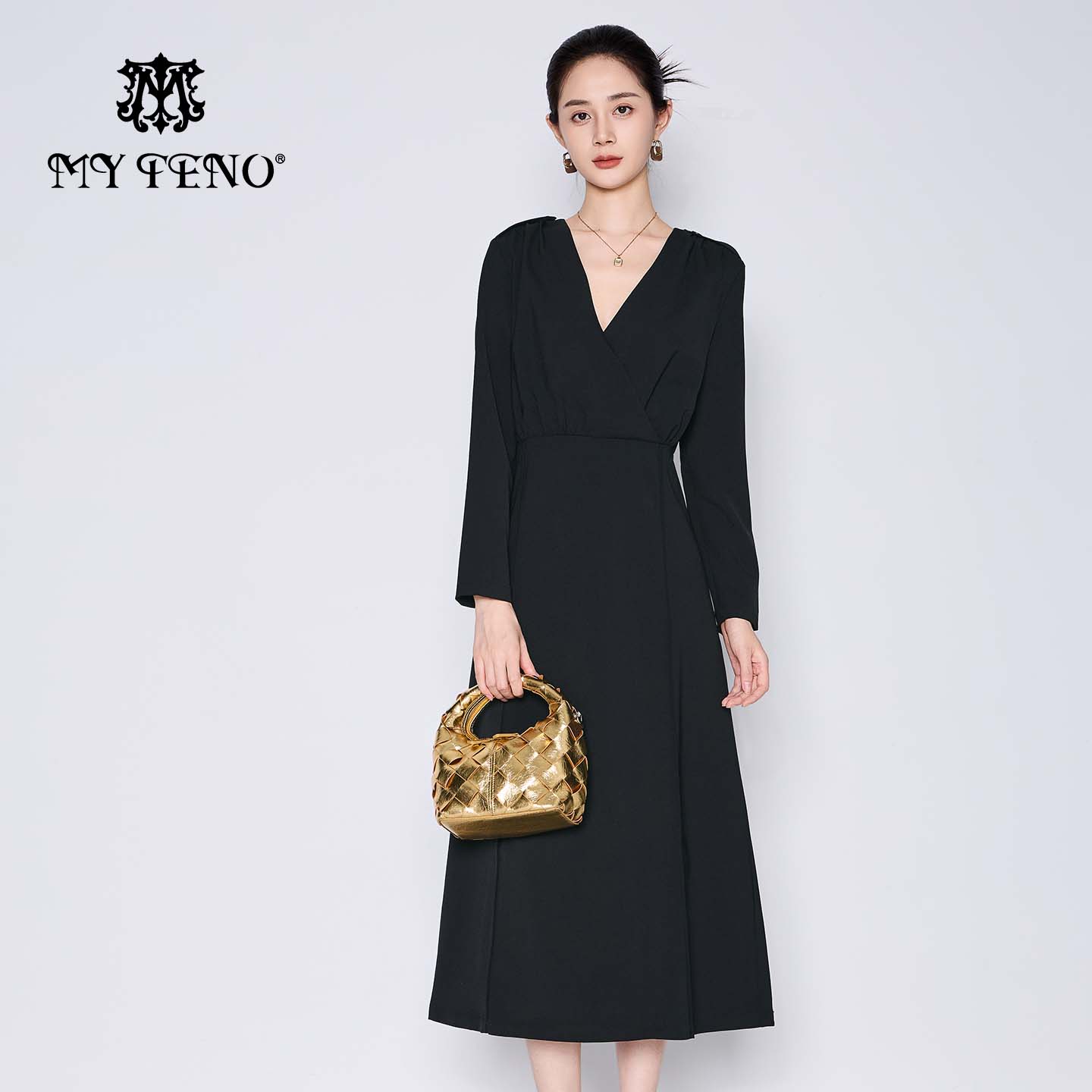 马天奴秋冬女装黑色钉珠V领收腰长袖连衣裙子气质法式赫本风时尚
