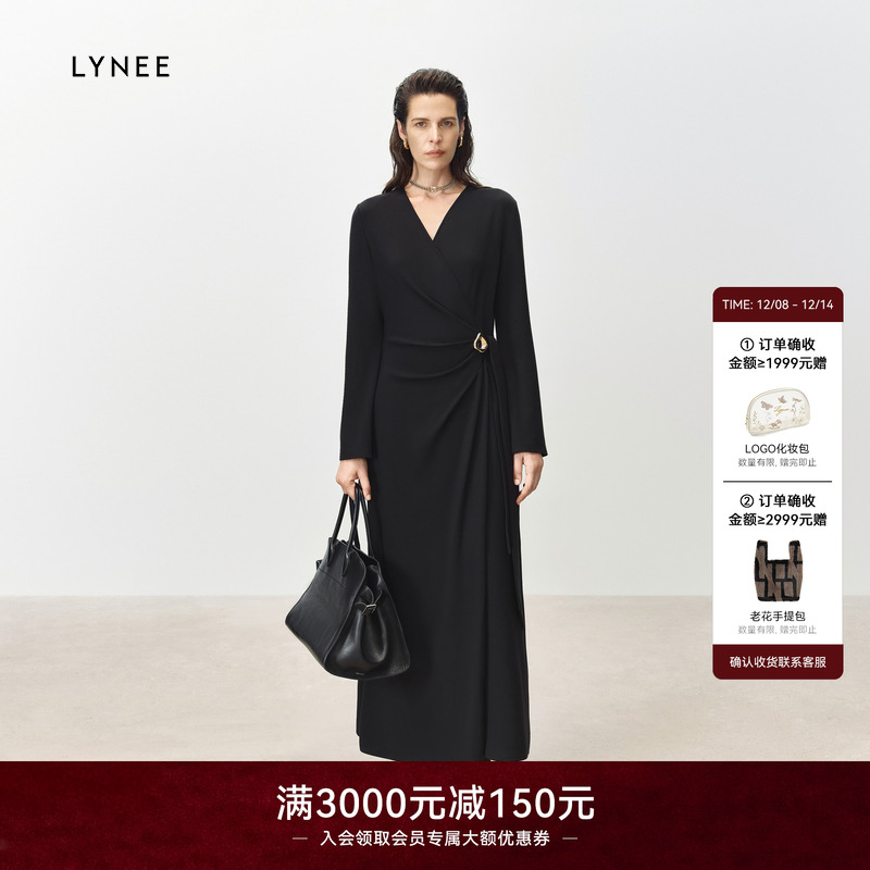 马天奴2025秋季新款纯色V领收腰长袖连衣裙子气质优雅通勤时尚女
