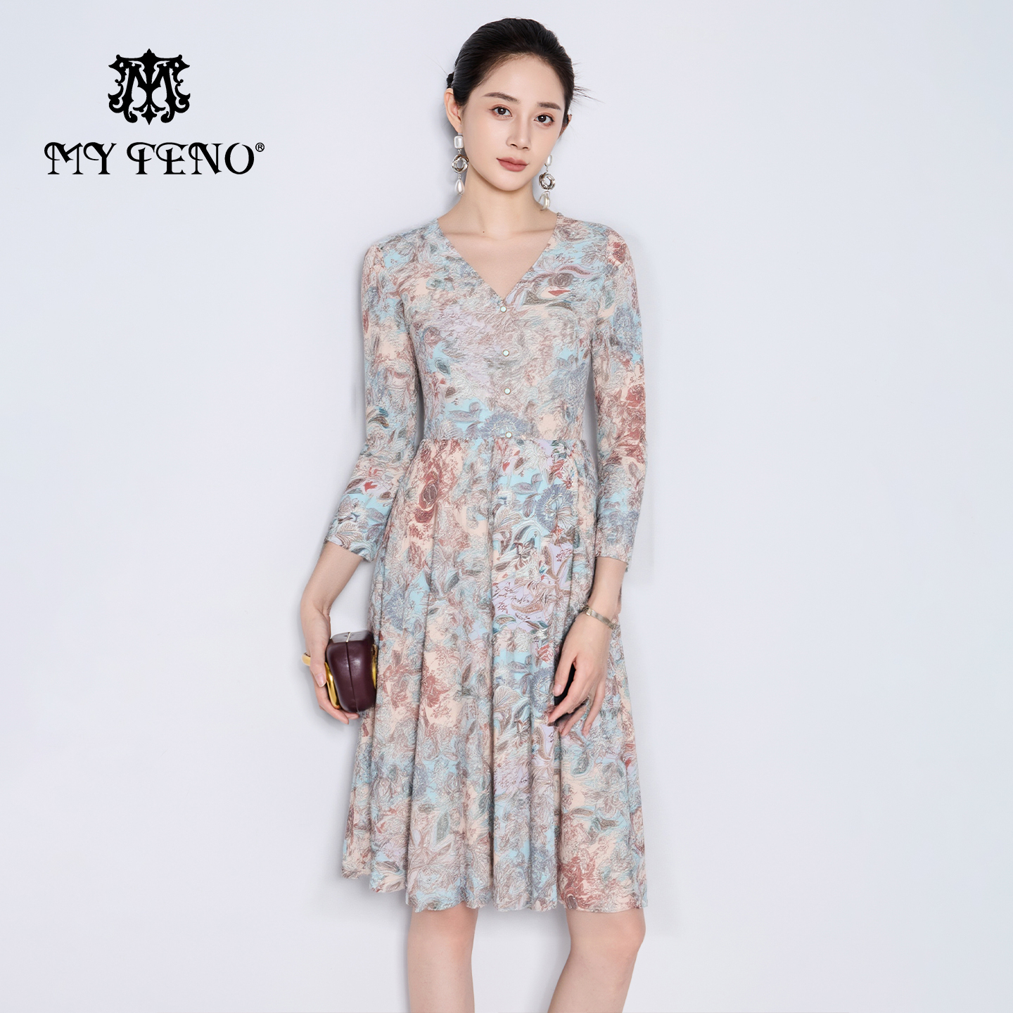 马天奴2025秋冬新款蓝色印花V领收腰长袖连衣裙子气质时尚度假女