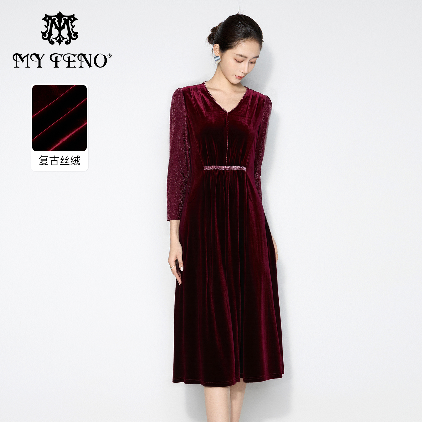 马天奴2025秋冬新款红色丝绒钉珠V领收腰长袖连衣裙子气质复古女