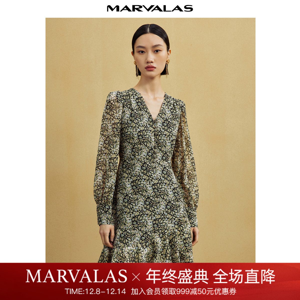 曼德诗V领收腰长袖连衣裙2025春秋新款优雅不规则荷叶边雪纺短裙