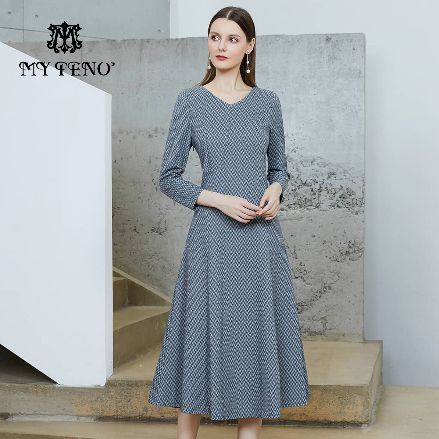 马天奴2025秋冬新款浅灰色提花V领收腰长袖连衣裙子气质时尚法式