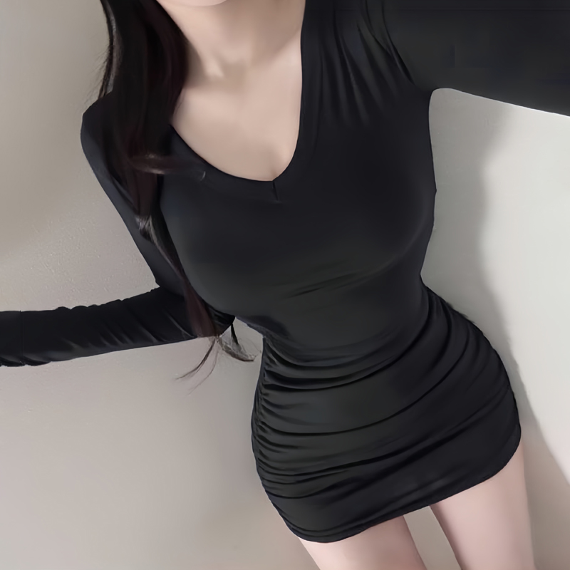 性感辣妹v领收腰长袖连衣裙女春秋温柔气质修身显瘦内搭包臀裙子