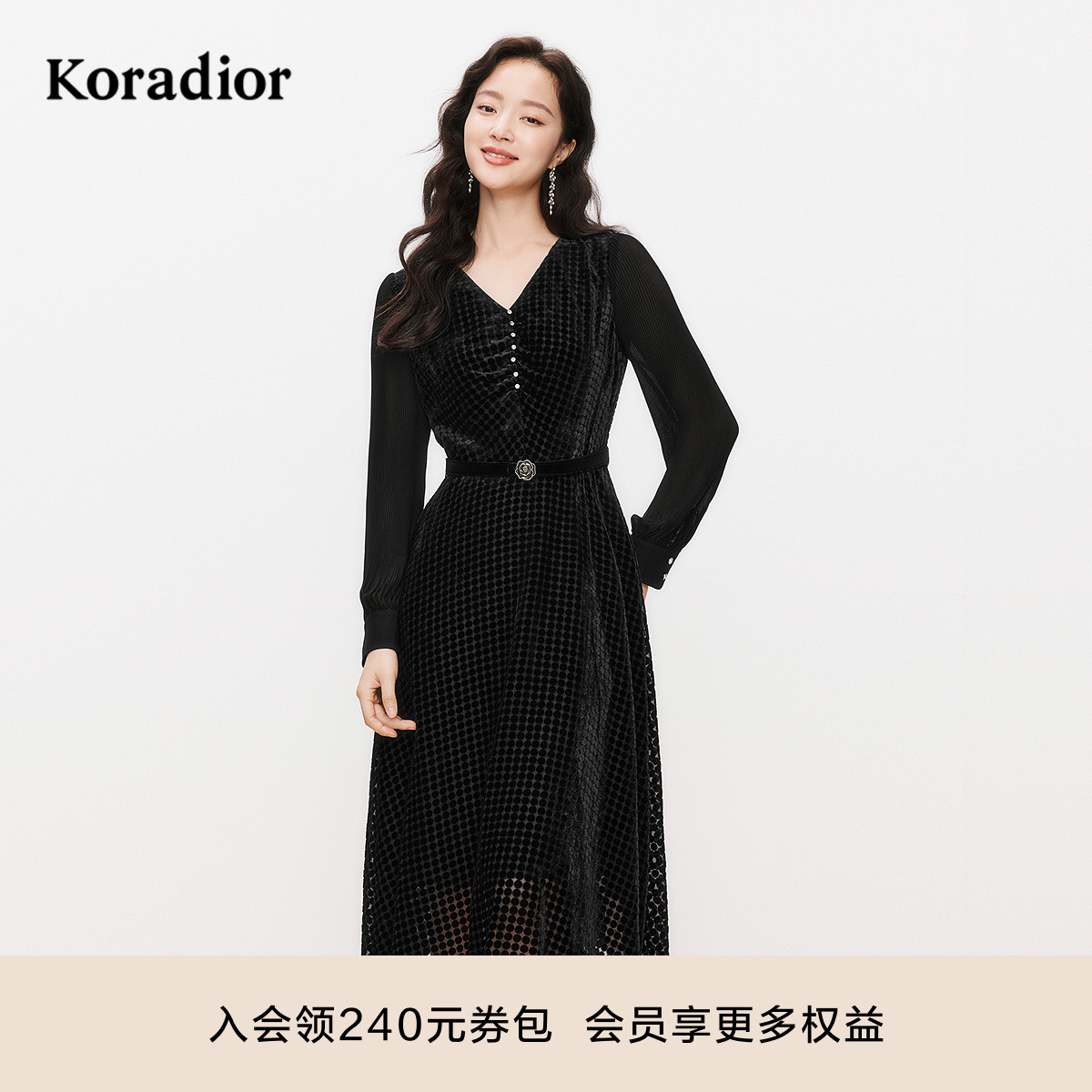 koradior珂莱蒂尔2025年春季新款气质优雅V领收腰长袖连衣裙女