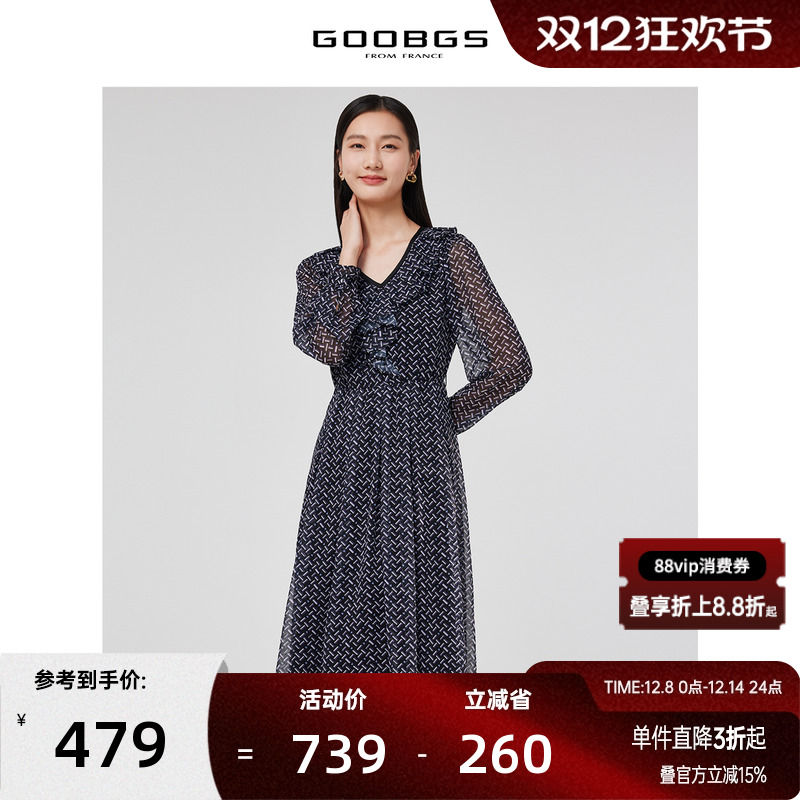 谷邦V领收腰长袖连衣裙2025春秋新款优雅气质雪纺显瘦印花中长裙