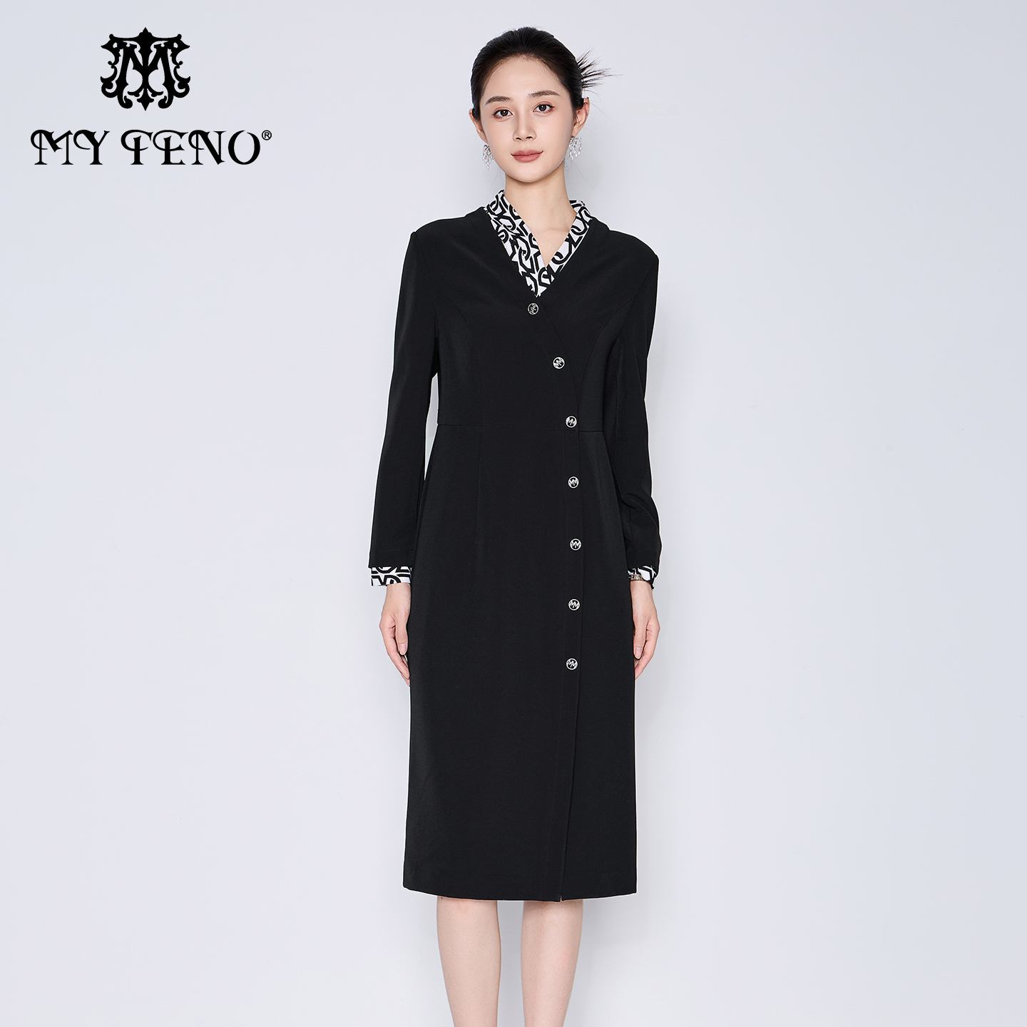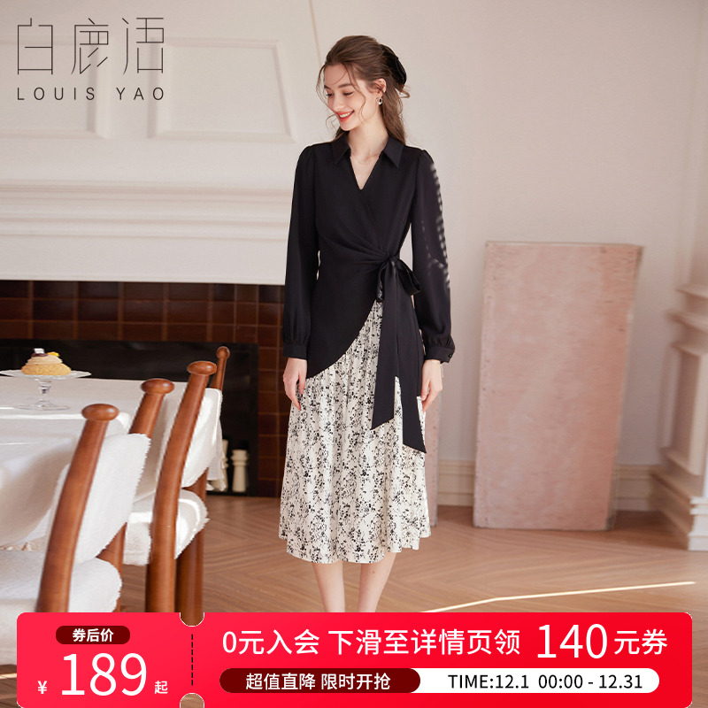 商场同款马天奴2025秋冬新款女黑色拼接印花V领收腰长袖连衣裙子