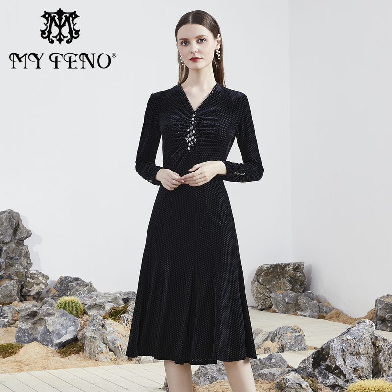 马天奴2025秋冬新款黑色丝绒钉珠V领收腰长袖连衣裙子气质法式女