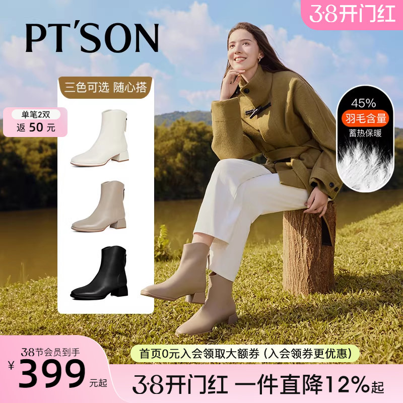 百田森黑色短靴女款小个子冬季高跟鞋子靴子加绒真皮靴法式小短靴