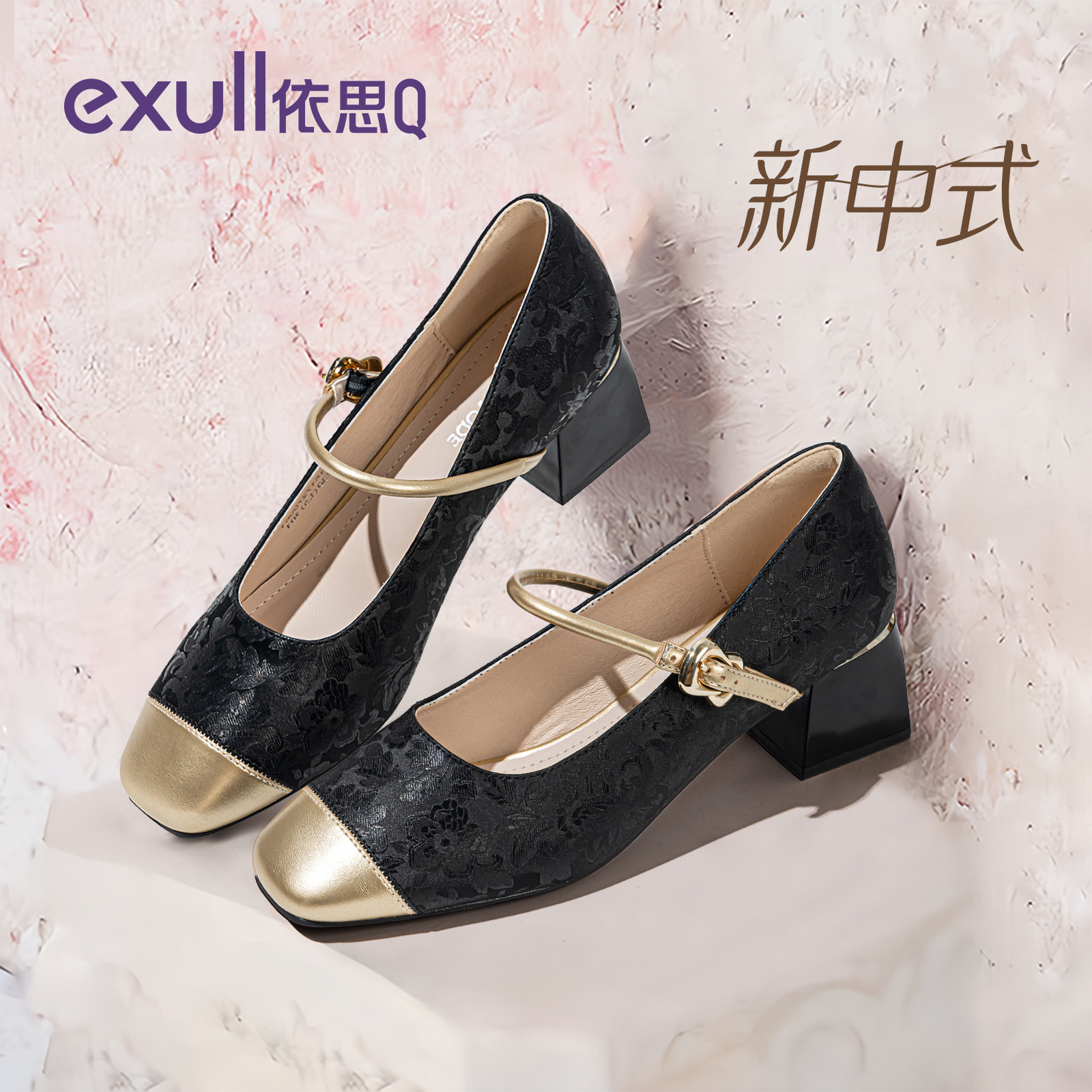 依思q粗跟单鞋女春季2026新款黑色新中式旗袍高跟鞋子女士玛丽珍
