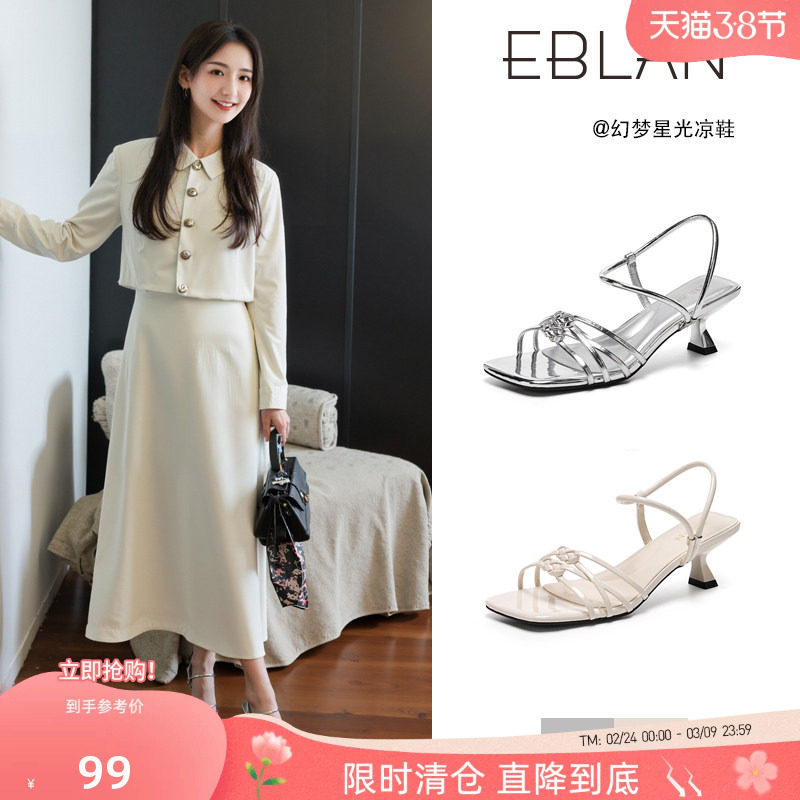 EBLAN/伊伴【99清仓福利】方头细跟凉鞋女一字带露趾法式高跟鞋子
