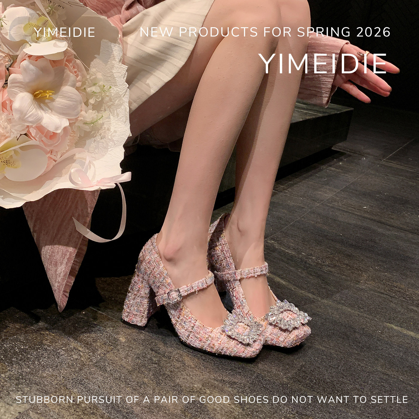 小香风玛丽珍粗跟单鞋女2026春季新款花呢布温柔浅口方头高跟鞋子