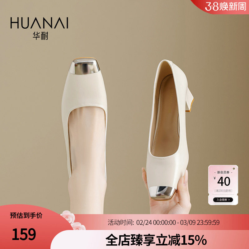 华耐粗跟单鞋女款2025春秋新款金属方头通勤百搭女鞋时装高跟鞋子