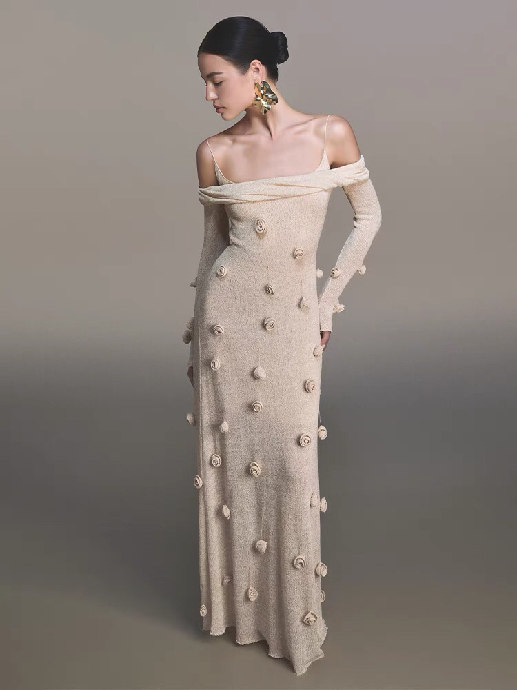 越南设计师小众气质立体花朵一字肩小礼服长裙弹力针织吊带连衣裙