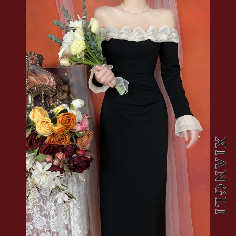 一字肩连衣裙女露锁骨法式复古赫本风小黑裙气质包臀开叉礼服裙子