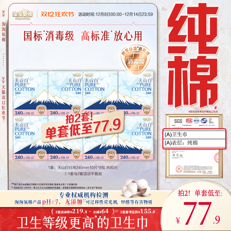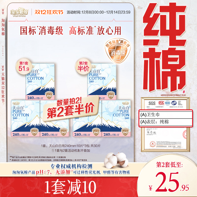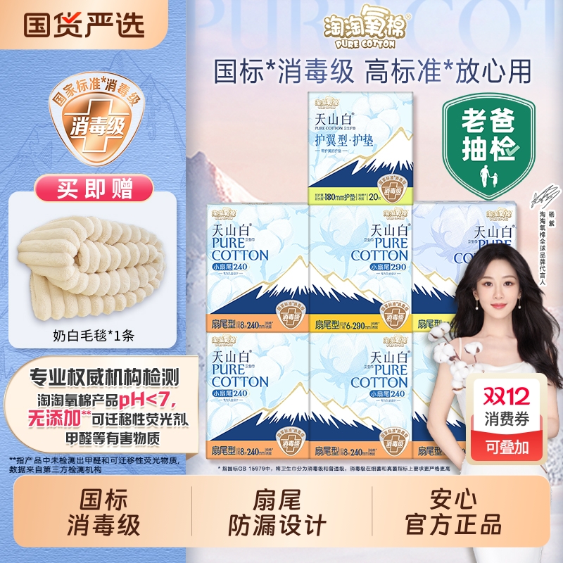 【国标消毒级】淘淘氧棉天山白消毒级纯棉卫生巾日用240mm组合装