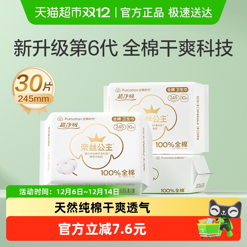 【优于新国标】全棉时代奈丝公主医护级卫生巾日用245mm*30片