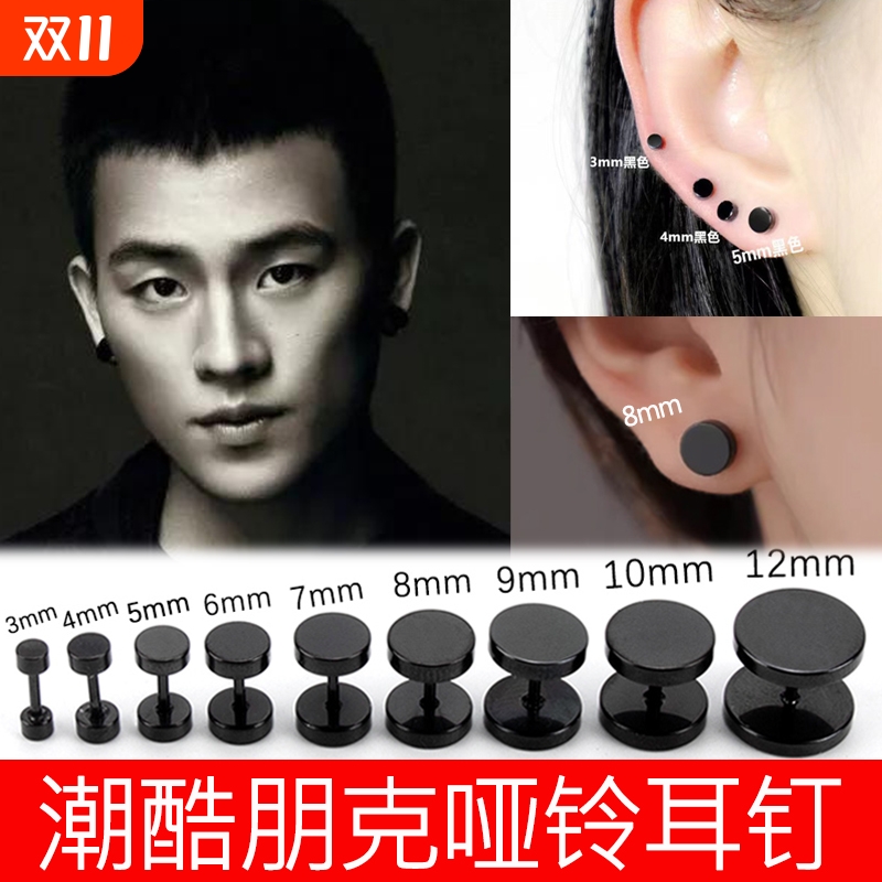 钛钢耳饰 美式哑铃耳钉男黑色圆饼螺丝拧扣耳环百搭个性女耳骨钉