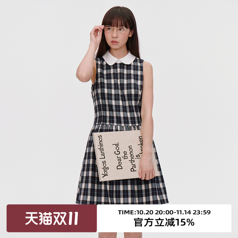 omont蛋挞家复古娃娃领收腰显瘦连衣裙2025夏季无袖格子背心裙子