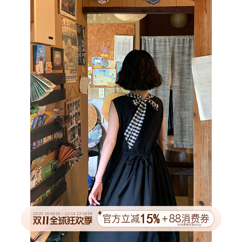 霍里德地图 拼接格子背心裙女夏季后背系蝴蝶结中长款黑色连衣裙