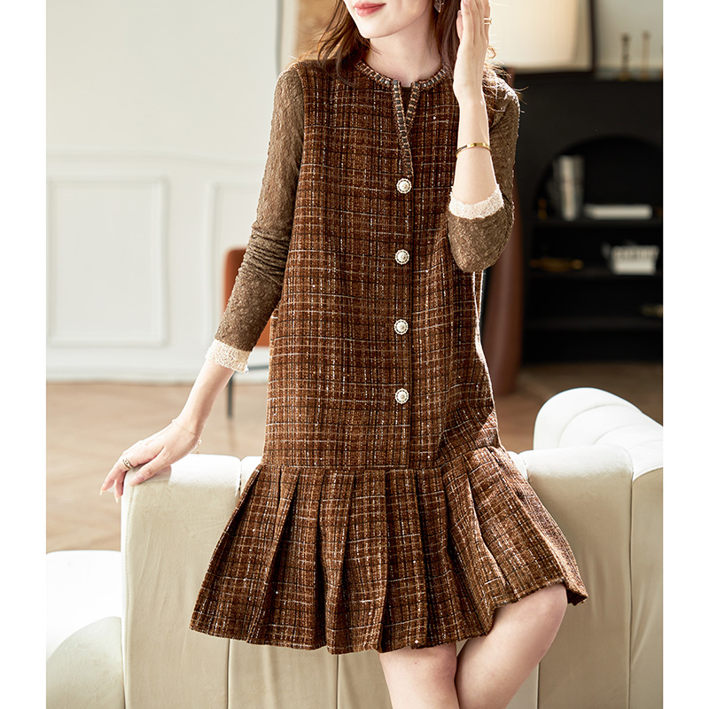 阔色假两件格子背心裙长袖连衣裙毛衣裙25秋冬季女长裙子内搭裙新