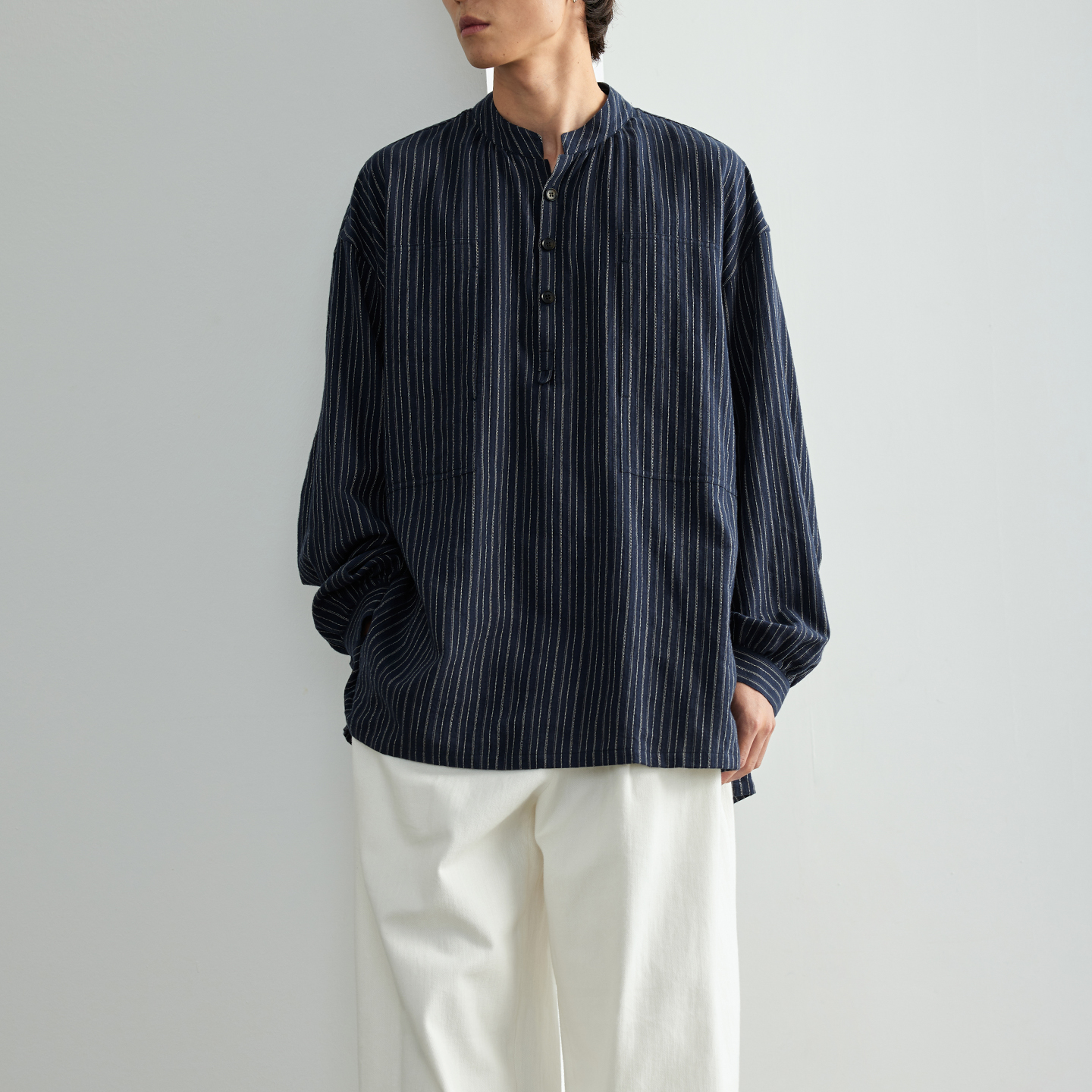 npopo日本进口棉简约纯色条纹长袖圆领衬衫休闲慵懒长款衬衣男