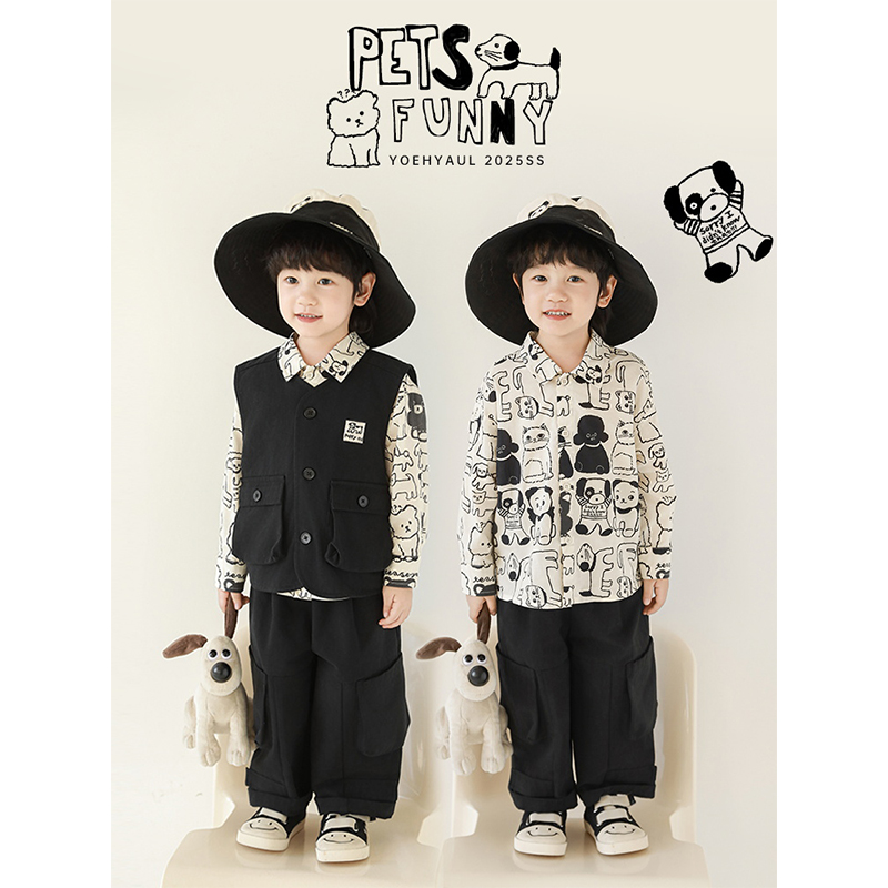 幼悠男童翻领小狗衬衫纯色百搭工装长裤叠穿马甲萌宠画报系列套装