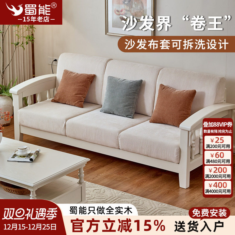美式风沙发地中海全实木沙发客厅家用田园小户型三人布艺沙发组合