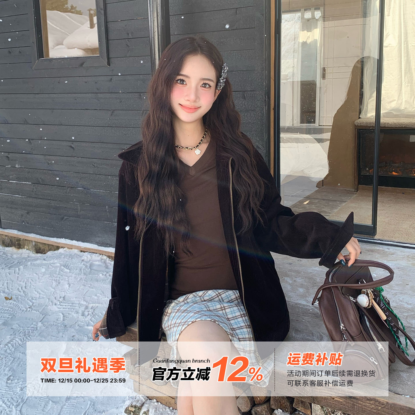 V领灯芯绒外套女秋冬2025新款韩系休闲多口袋设计感洋气全棉上衣