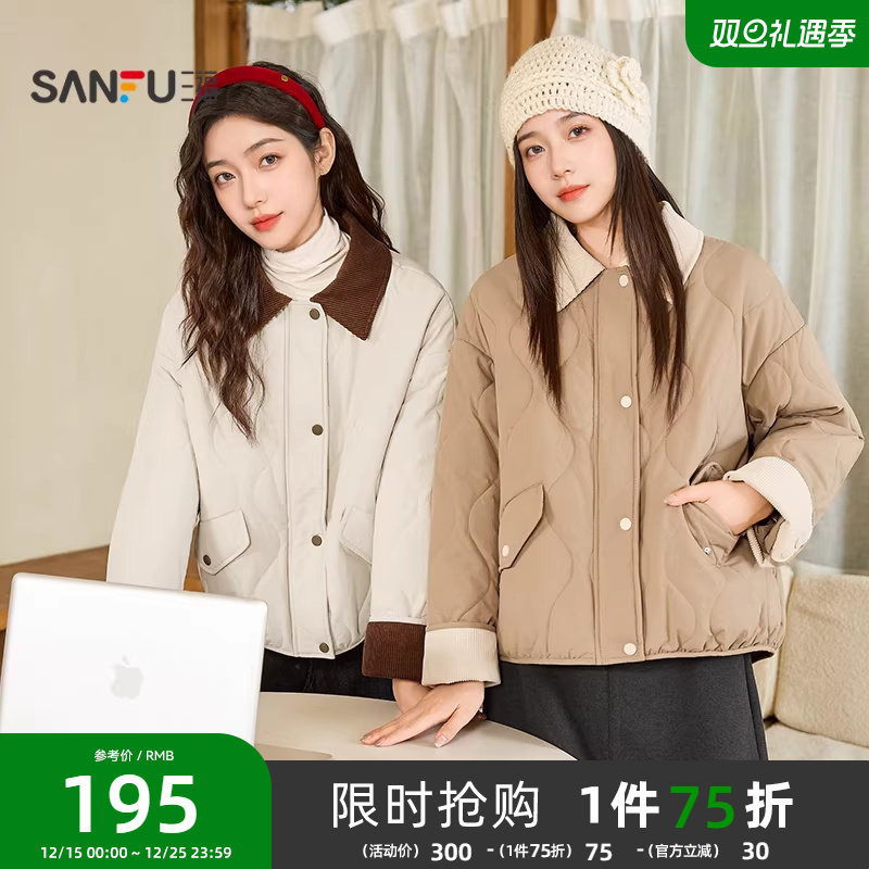 三福棉衣棉服2025新款冬季拼接灯芯绒翻领棉袄小个子宽松外套女装