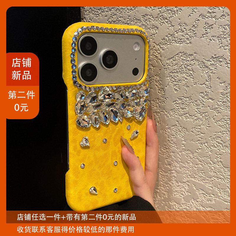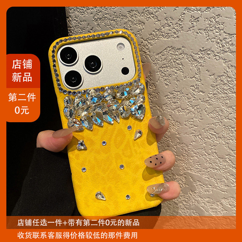 黄色豹纹钻石适用苹果17手机壳opporeno15立体vivos50华为pura80奢华mate70水钻小米14闪钻红米k90荣耀x70i女