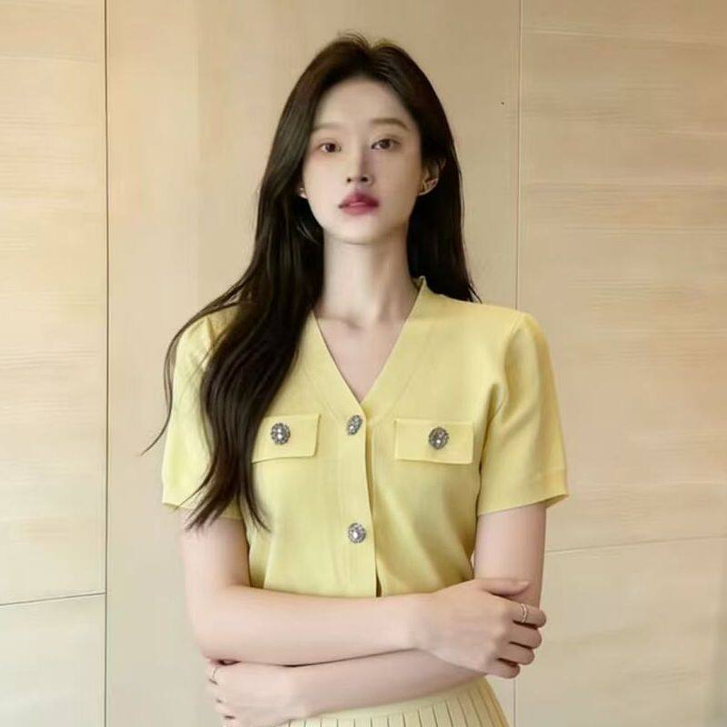 2026夏新款小香风黄色针织开衫女 V领短款上衣钻石扣修身外套