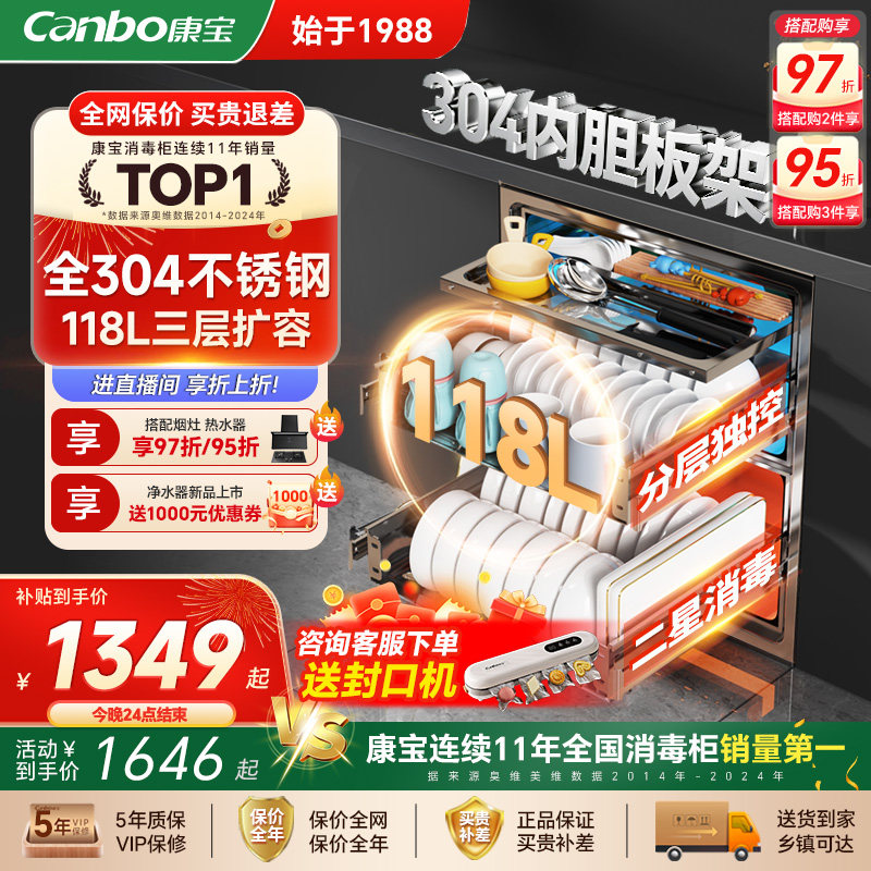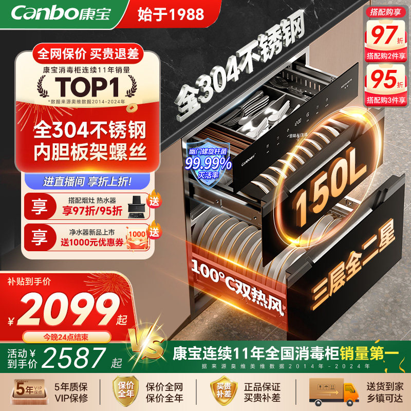 康宝巨量消毒柜嵌入式家用150L全304不锈钢碗柜碗筷热风烘干新款