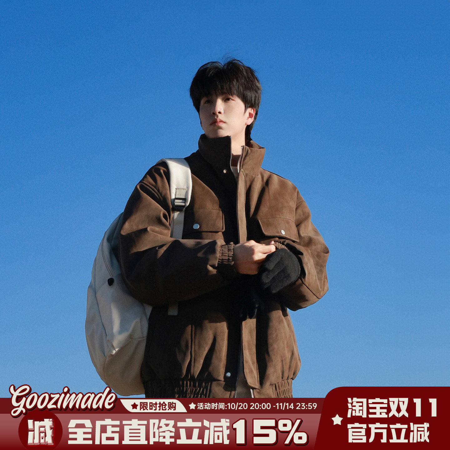 @港仔文艺男 美式复古麂皮绒立领羽绒服男冬季男生工装外套男款