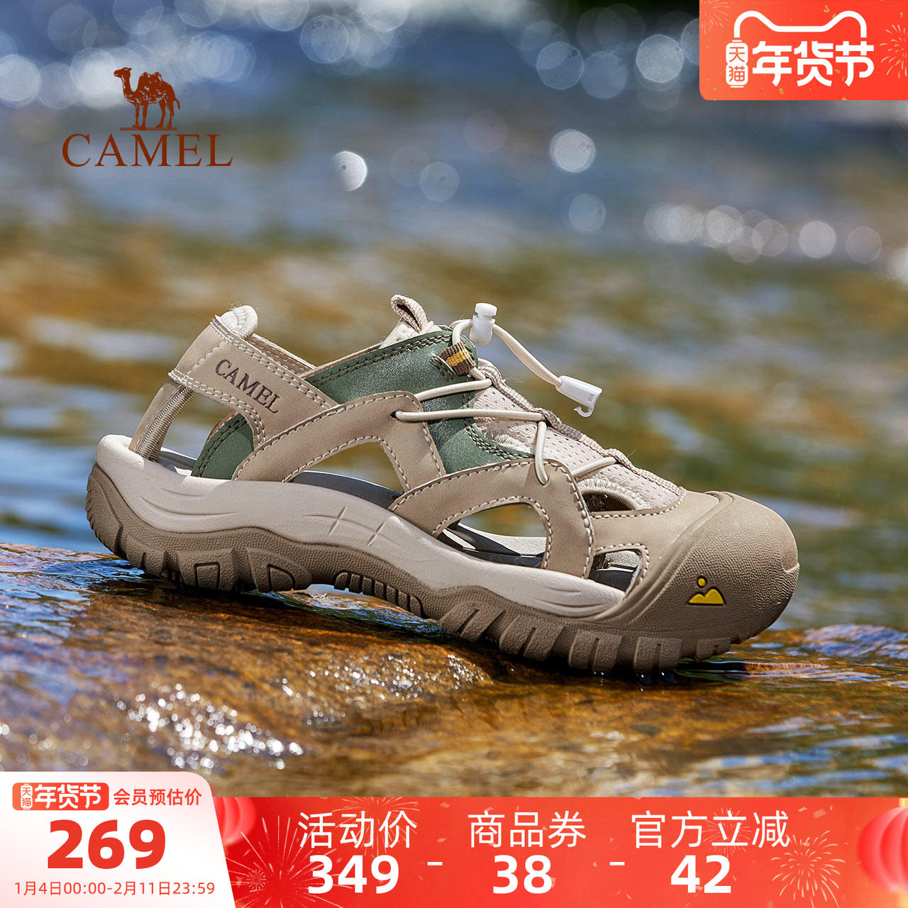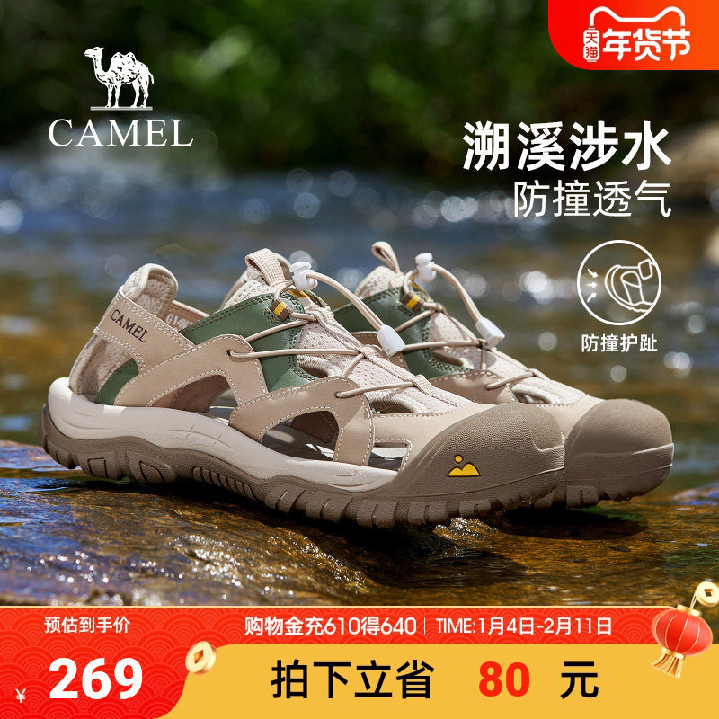 骆驼男鞋2025年缓震透气网布止刹疏水防撞厚底城市户外凉鞋男沙滩