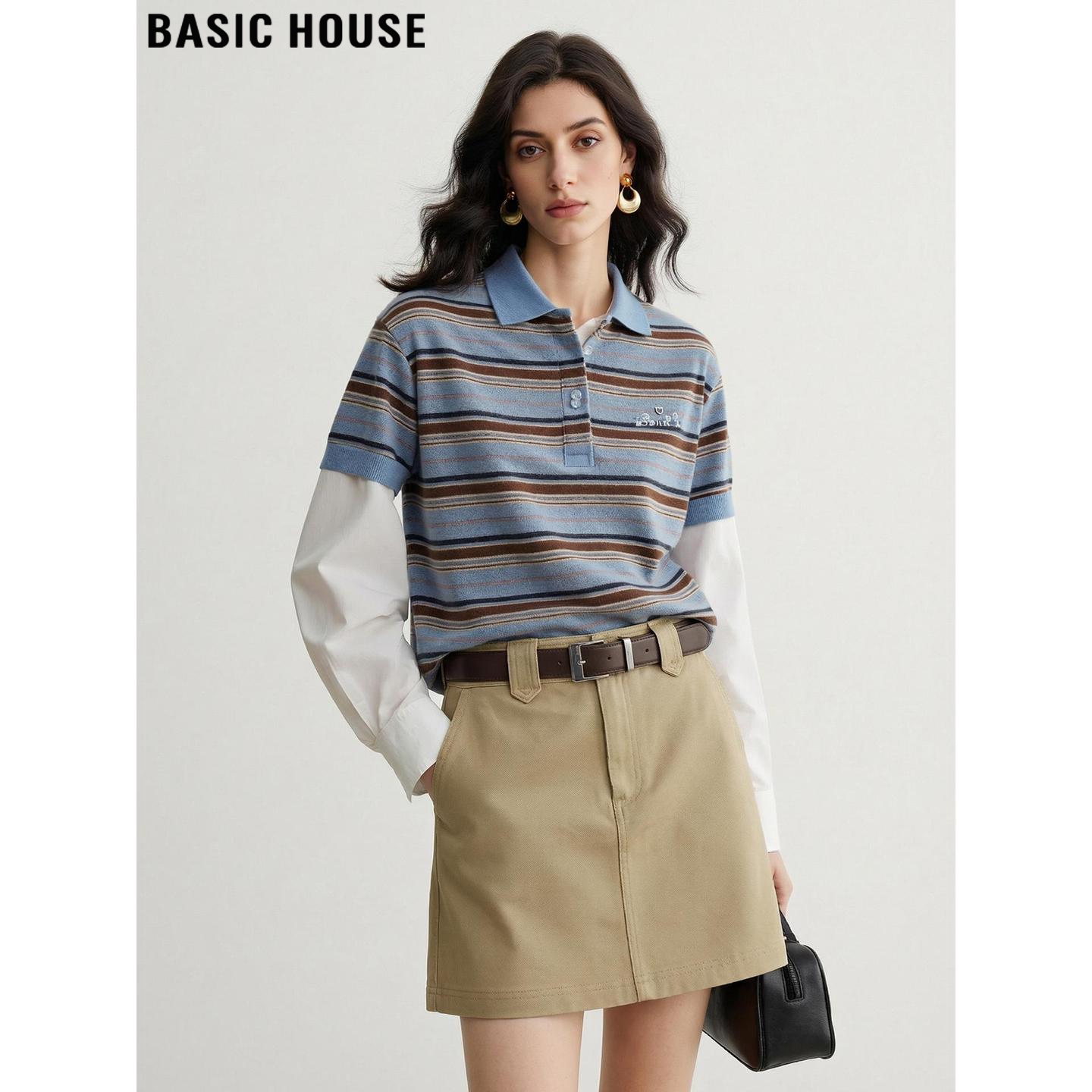 Basic House/百家好卡其色天丝牛仔短裙女夏季高腰A字包臀半身裙