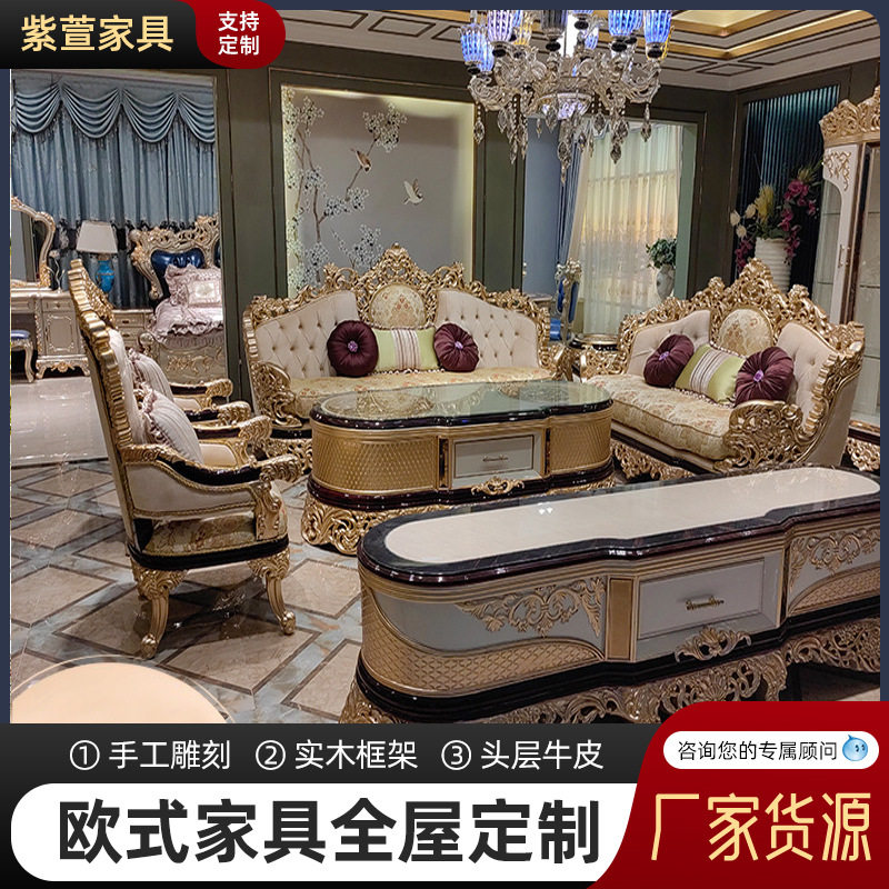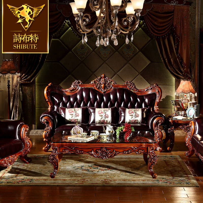 欧式实木雕花沙发客厅别墅大平层沙发高档加厚头层真皮沙发大户型