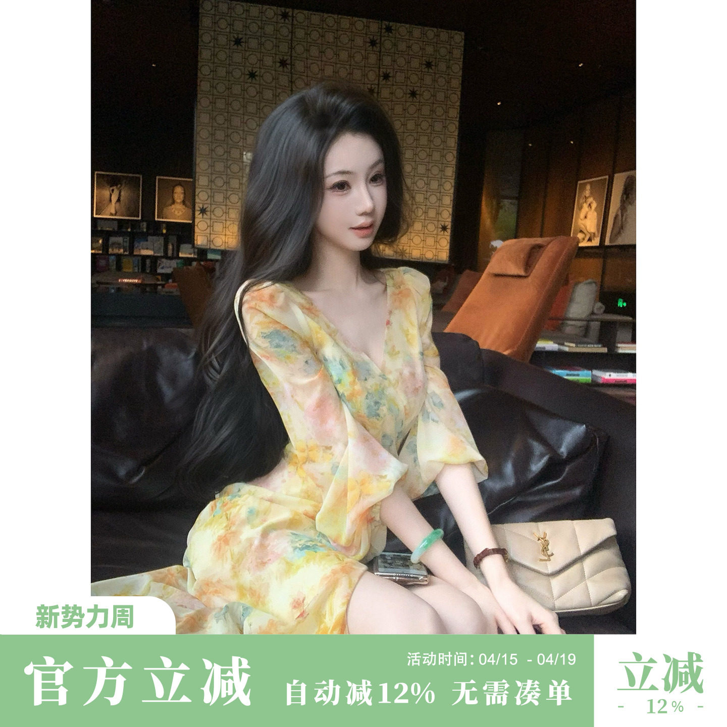 Sun雅乔【吉维尼花园】夏季海边度假灯笼袖水彩晕染油画连衣长裙
