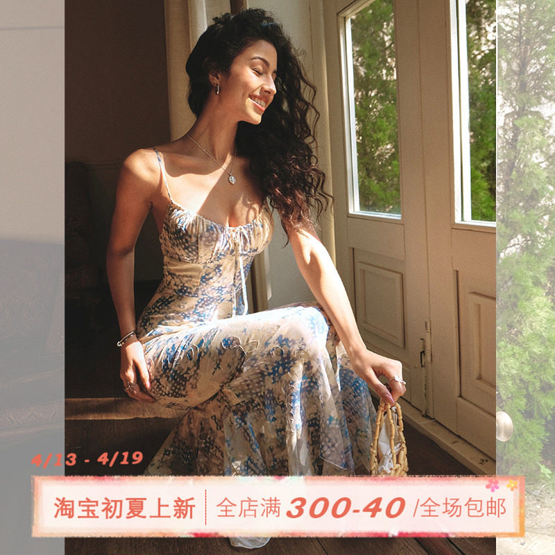 ITSNIKAR【清酒裙】蓝色碎花连衣裙女性感吊带长裙海边度假鱼尾裙