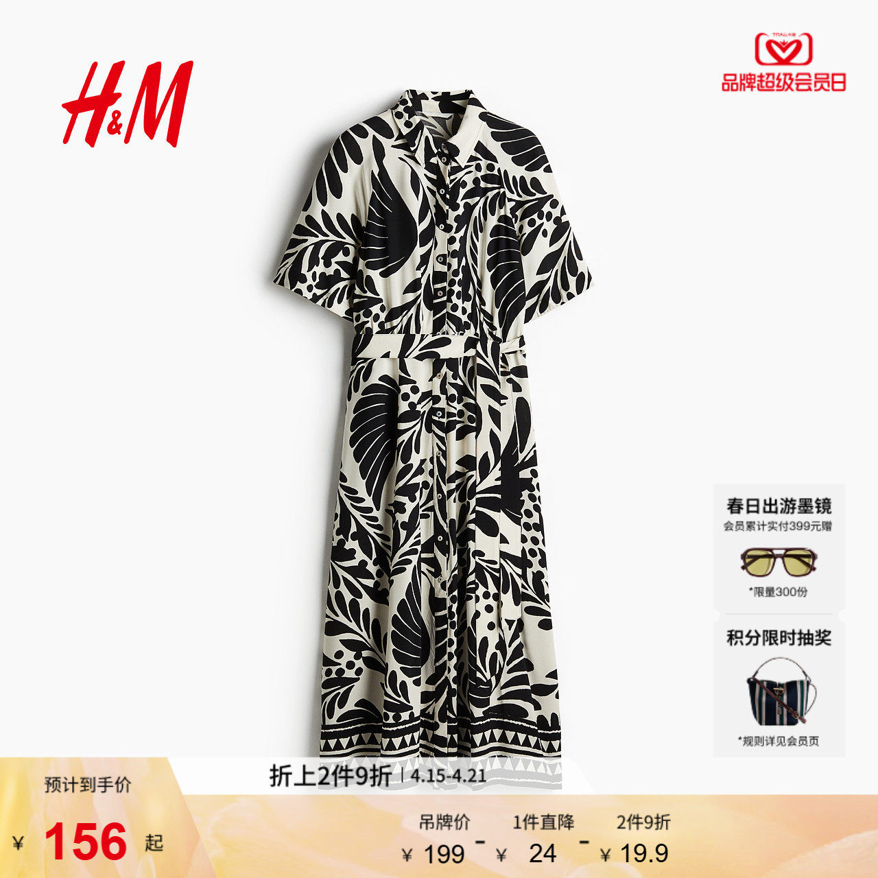 HM女装连衣裙海边丁达尔束腰度假风衬衫式植物印花长裙1217576