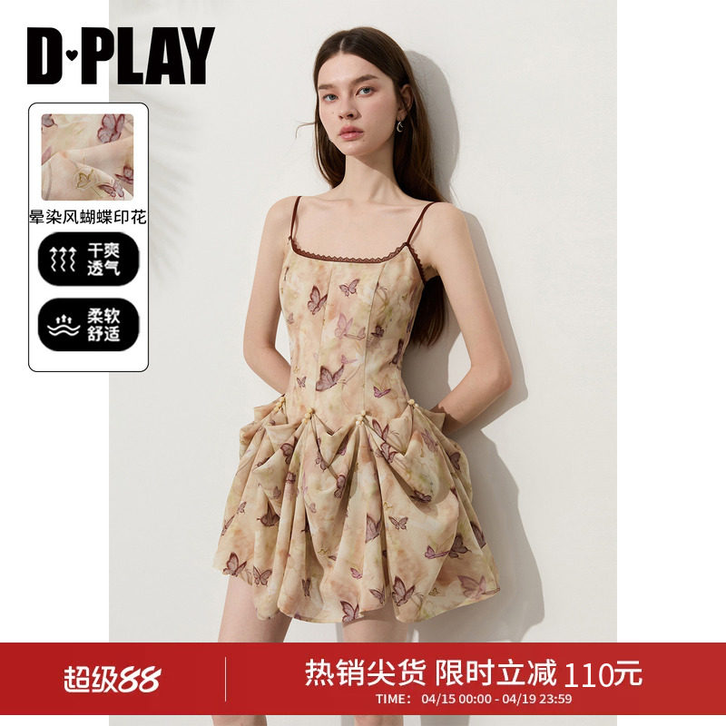 DPLAY复古蝴蝶印花吊带连衣裙2026夏季新款海边度假裙长裙蓬蓬裙