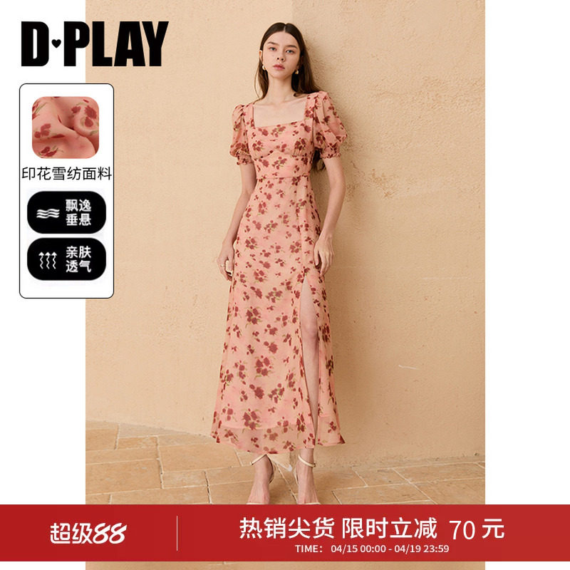 DPLAY2026年夏季粉色印花连衣裙度假沙滩裙女法式雪纺长裙鱼尾裙