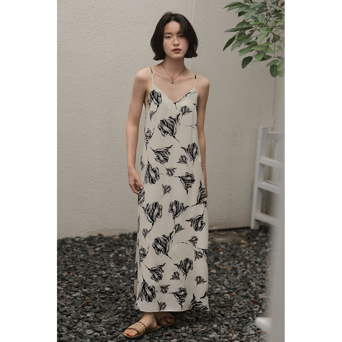 弥古法式复古碎花吊带连衣裙女夏高级感v领雪纺长裙海边度假裙子